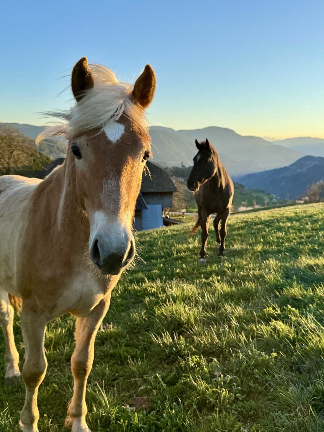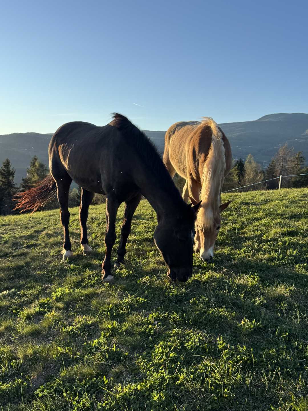 Unser Hofhund Bessy ist sehr lieb und verspielt, sie liebt es gestreichelt zu werden und Fußball zu spielen. Im Hasenstall leben einige Hasen und im Stall haben wir Kuhkälber und Nutztiere sowie unsere zwei Pferde Chenai und Starlight und nicht zu vergessen unsere lieben Zwergziegen! Gerne dürfen auch Sie und Ihre Kinder, in Anwesenheit des Bauern Martin oder Bäuerin Tanya, die kleinen Kälber, Pferde und Ziegen streicheln, striegeln und füttern. Die Pferde dürfen aber nicht geritten werden. Bei der Feldarbeit dürfen Sie gerne dabei sein und die Hof- und Heuarbeit eines Bauern näher kennen lernen.
