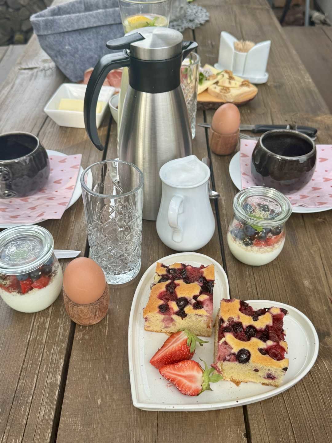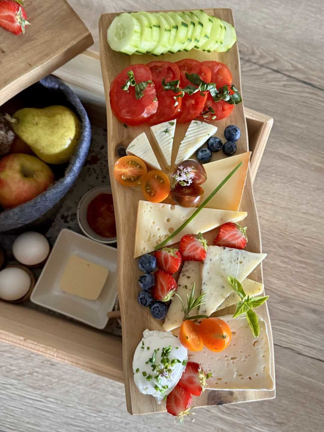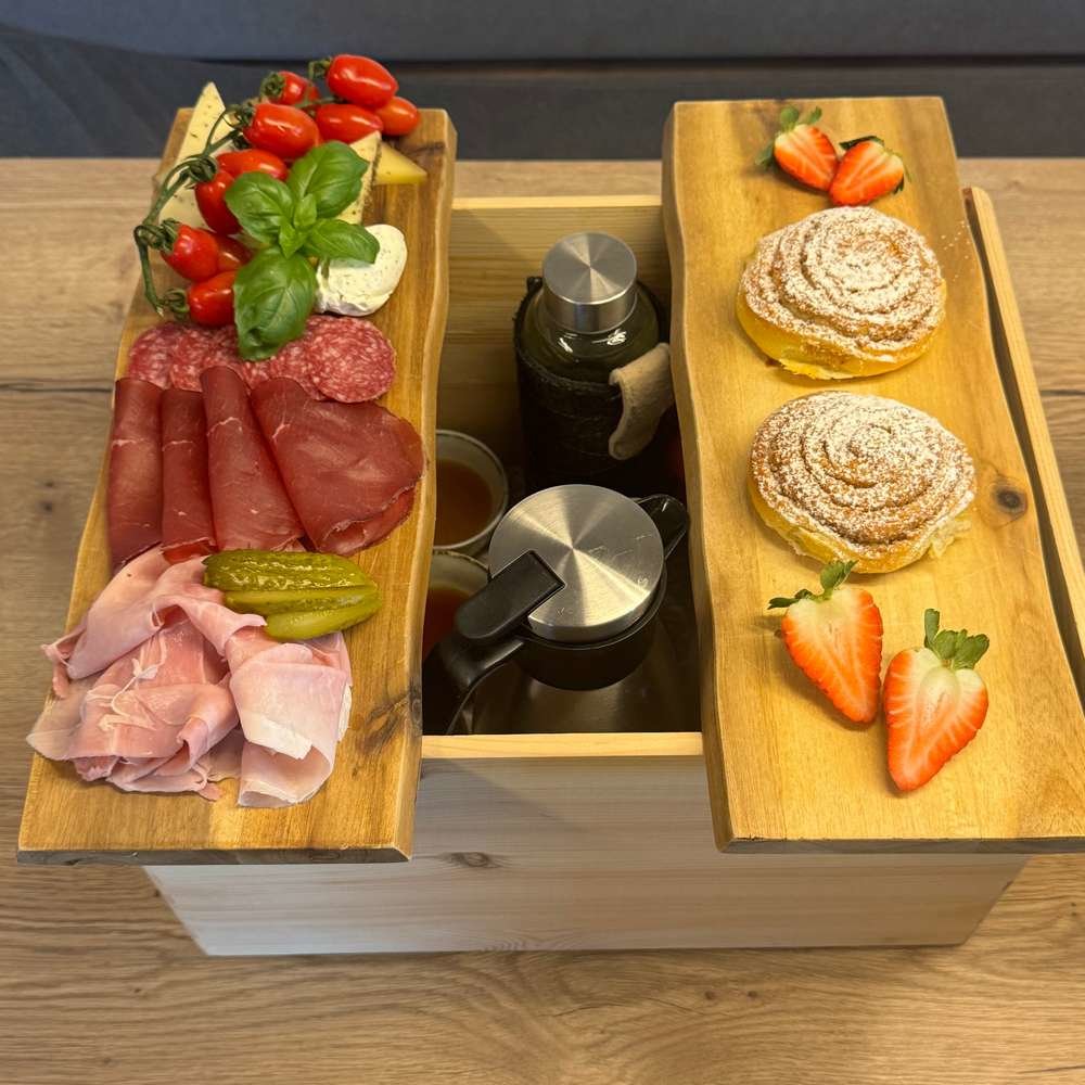 Jeder Urlaubstag beginnt mit einem leckeren Frühstück – einem Bauernhoffrühstück! Wir bringen Ihnen auf Wunsch morgens einen Frühstückskorb in Ihre Ferienwohnung vorbei, in dem Sie viele Leckereien vom Hof finden: frische Eier, knuspriges hausgemachtes Gebäck oder Kuchen, aromatische Fruchtaufstriche, herzhafte Aufstriche, duftendes Kräutersalz, wohlriechende Kräutertees oder Kaffee, selbstgemachten Sirup, frischgepresste Gemüse- Obstsäfte oder Smoothies, hausgemachtes Granola, Nüsse, auf Wunsch verschiedene Eierspeißen und frisches saisonales Obst. Außerdem gibt es Brot und Brötchen von unserem Dorfbäcker und köstlichen Honig vom Nachbarn. Almkäse, Wurstwaren, Joghurt, Milch und weitere regionale Produkte stammen von bäuerlichen Genossenschaften aus Südtirol.